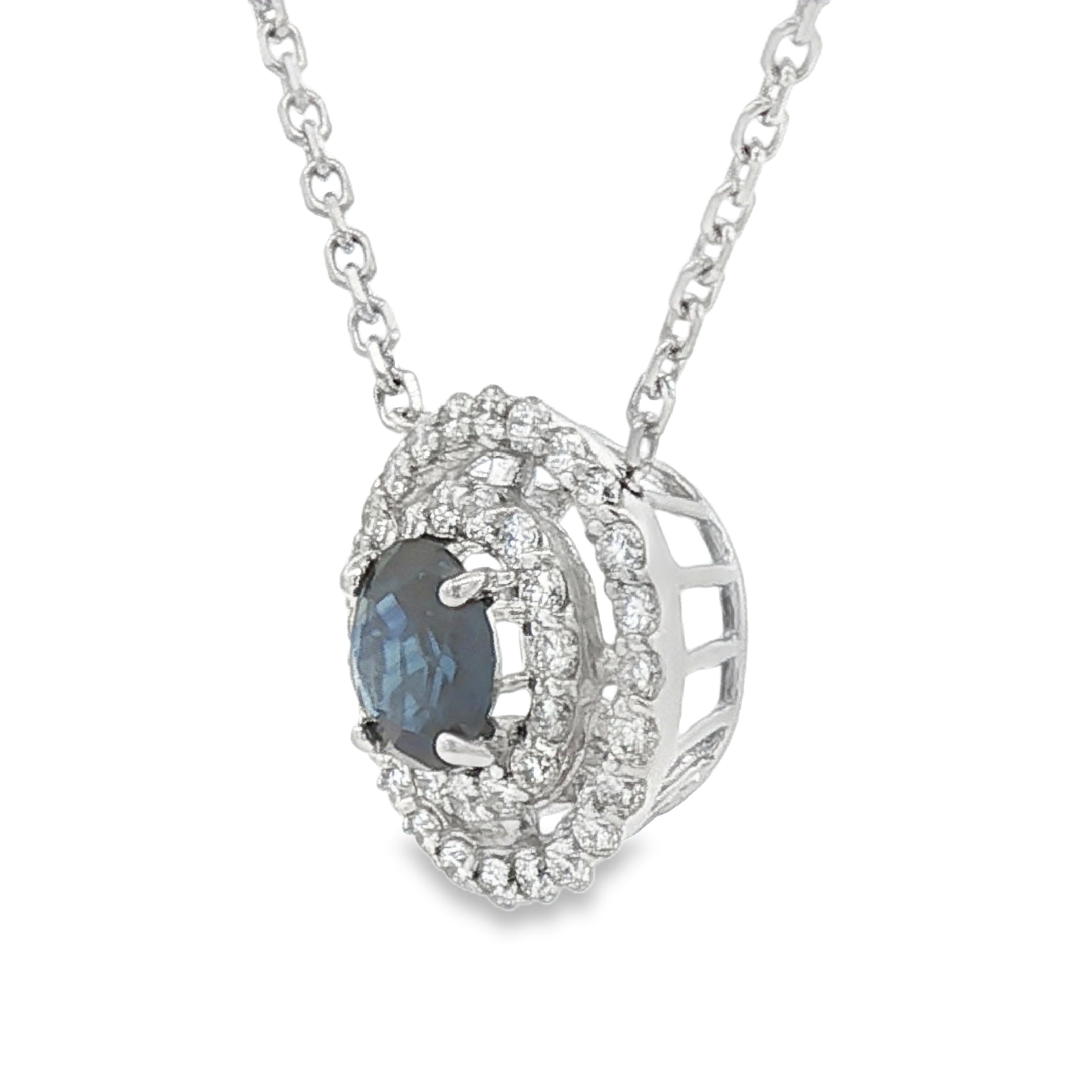 14 Karat White Gold Sapphire and Diamond Double Halo Necklace – 16"