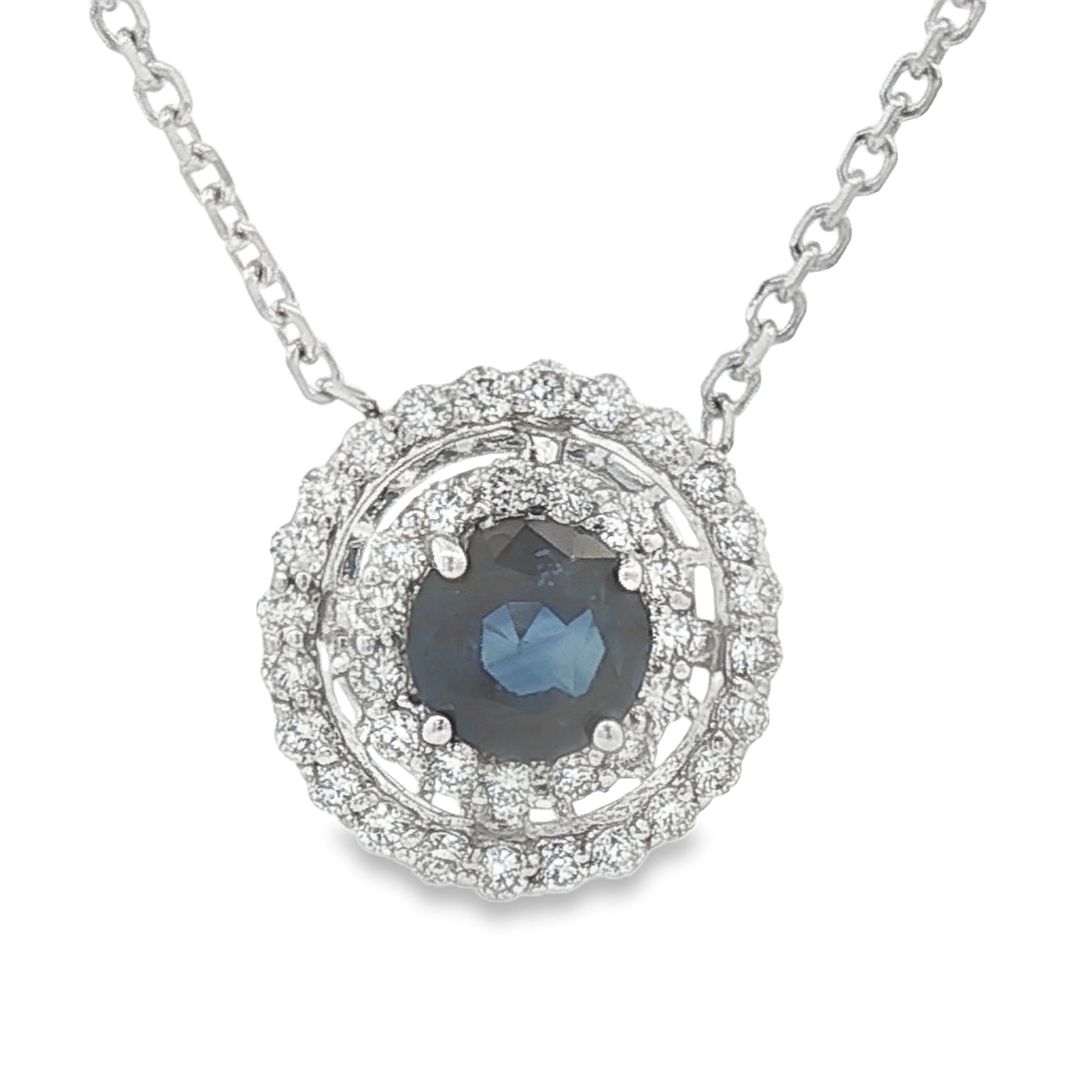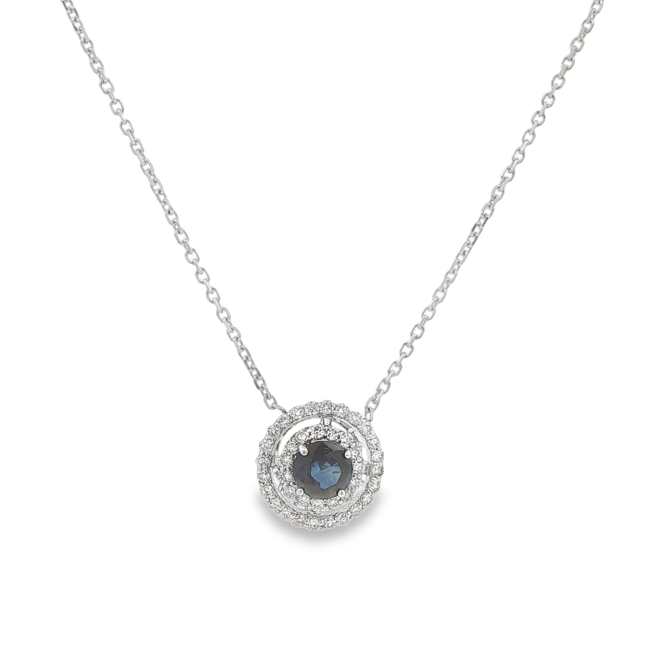 This refined 14 karat white gold necklace features a brilliant 0.50 carat round sapphire center, admired for its rich blue hue and timeless appeal. The sapphire is surrounded by a dazzling double halo of round diamonds that enhance its brilliance and create a striking, layered sparkle.