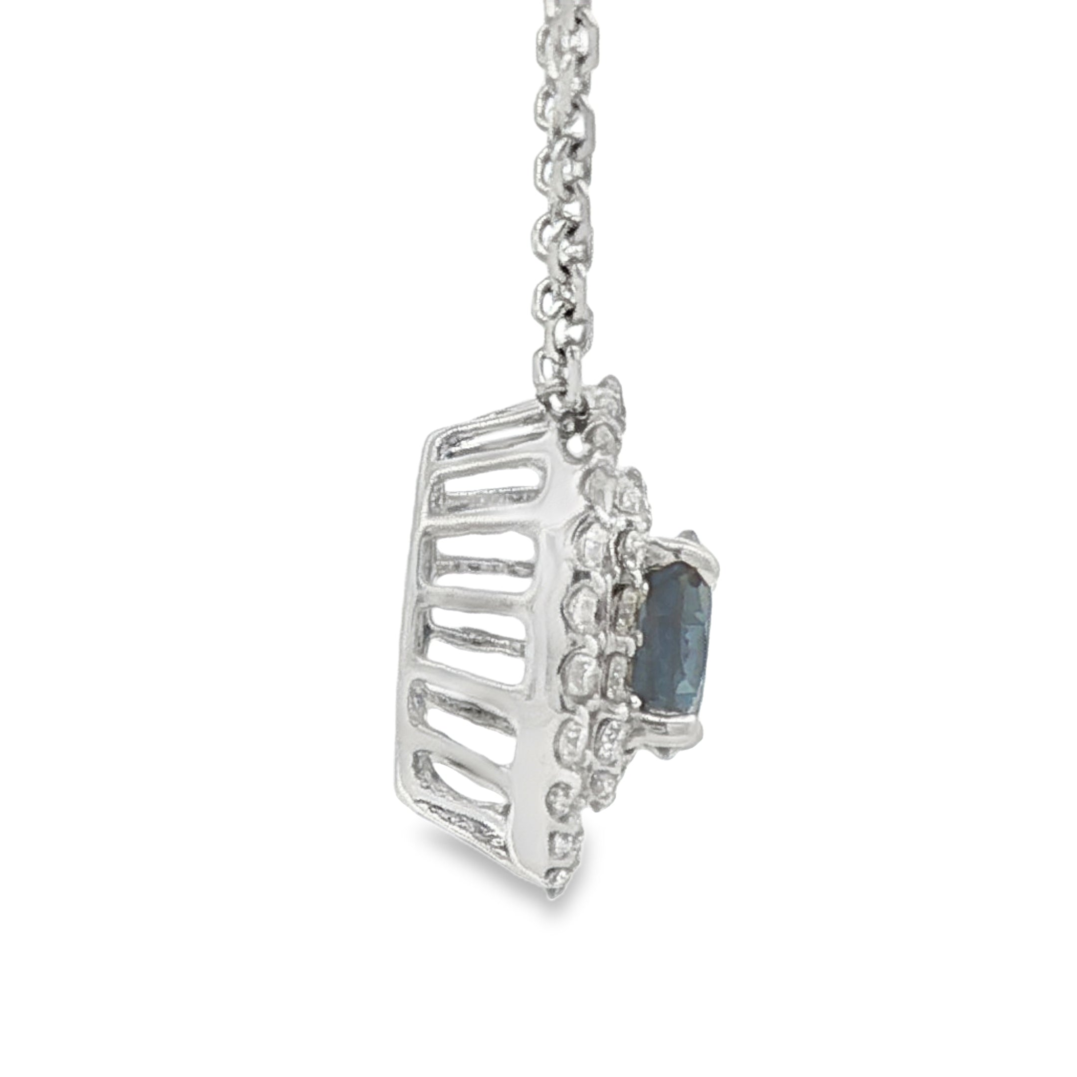 With a total diamond weight of 0.27 carat, the diamonds provide beautiful contrast and radiant shimmer against the polished white gold setting. Suspended from a 16-inch white gold chain and secured with a reliable spring ring clasp, this elegant sapphire and diamond necklace is perfect for special occasions, anniversaries, or meaningful gifting.
