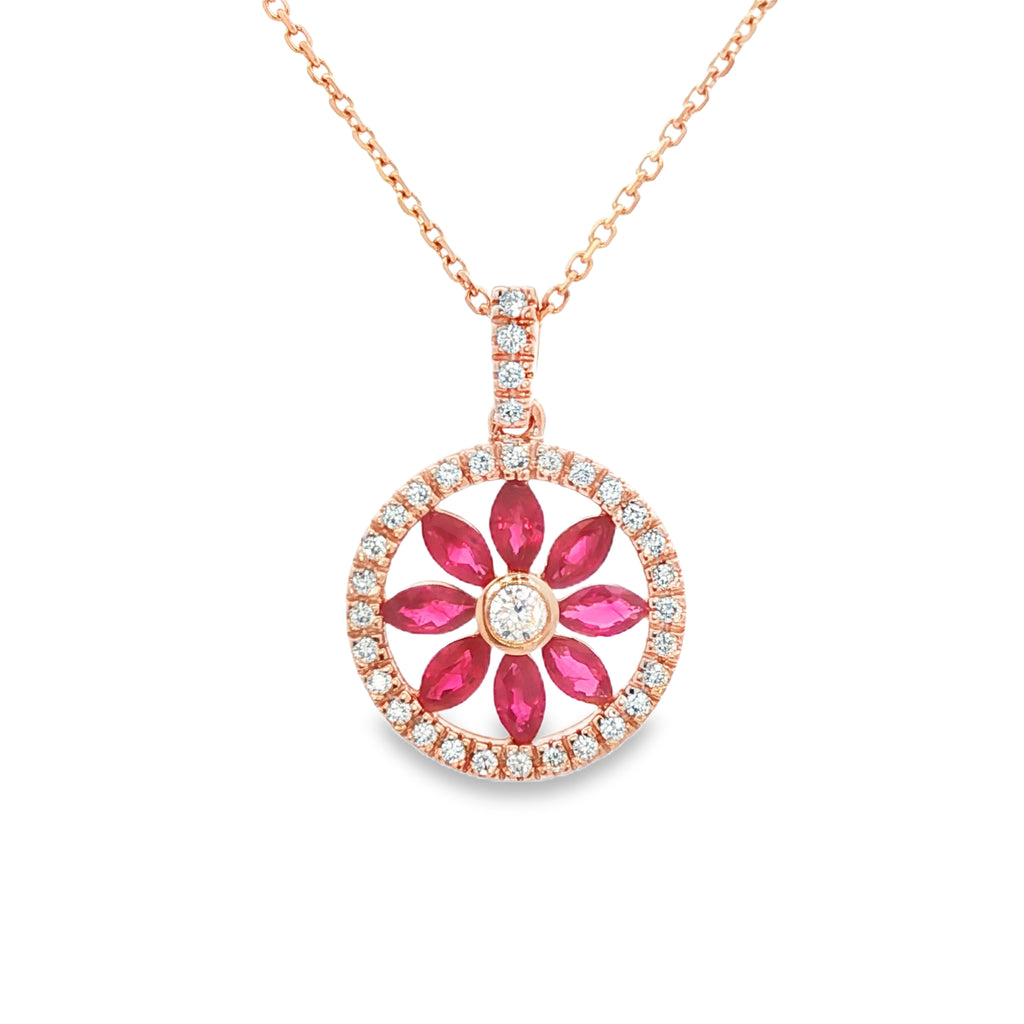 Enchanting rose gold necklace showcasing a captivating flower design, adorned with vibrant red, marquise-cut rubies set in an floral arrangement. A dazzling diamond halo adds an extra layer of sophistication to this exquisite floral-inspired piece, designed to bring a touch of nature's beauty to any ensemble. Secured with a 16" spring ring clasp, this piece blends rich color and elegant design for a timeless look.