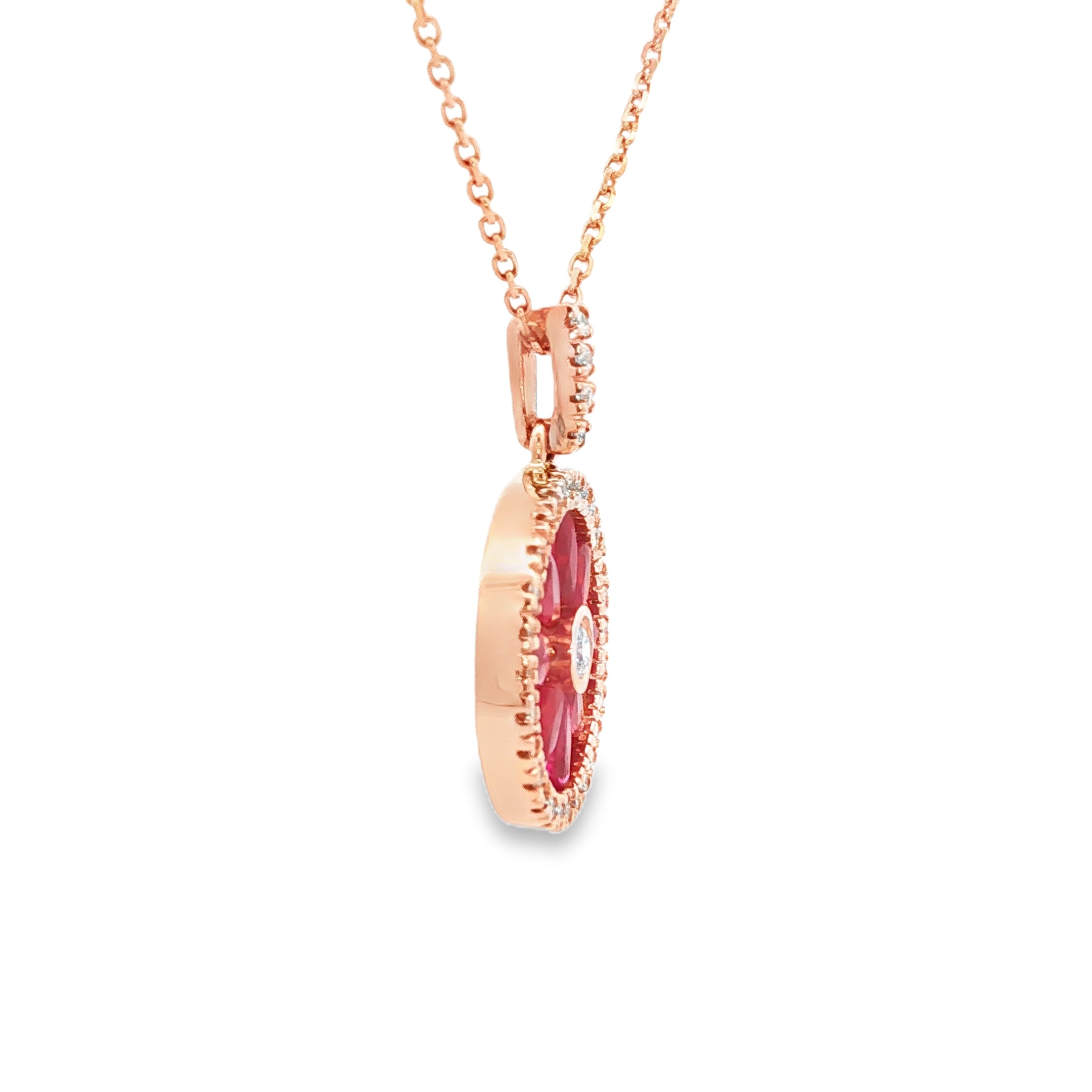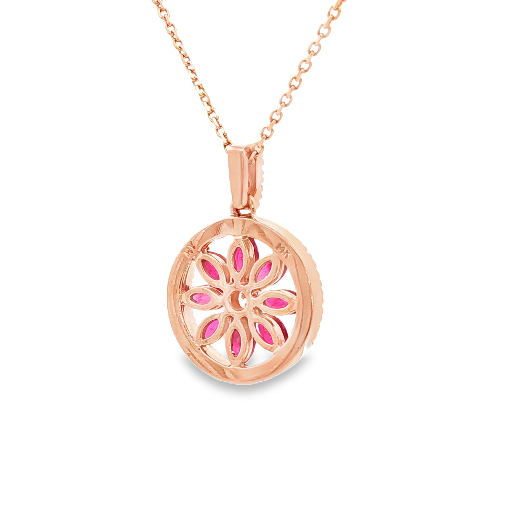 14K Rose Gold 1.28 Carat Ruby & 0.27 Carat Diamond Floral Halo Necklace – 16"