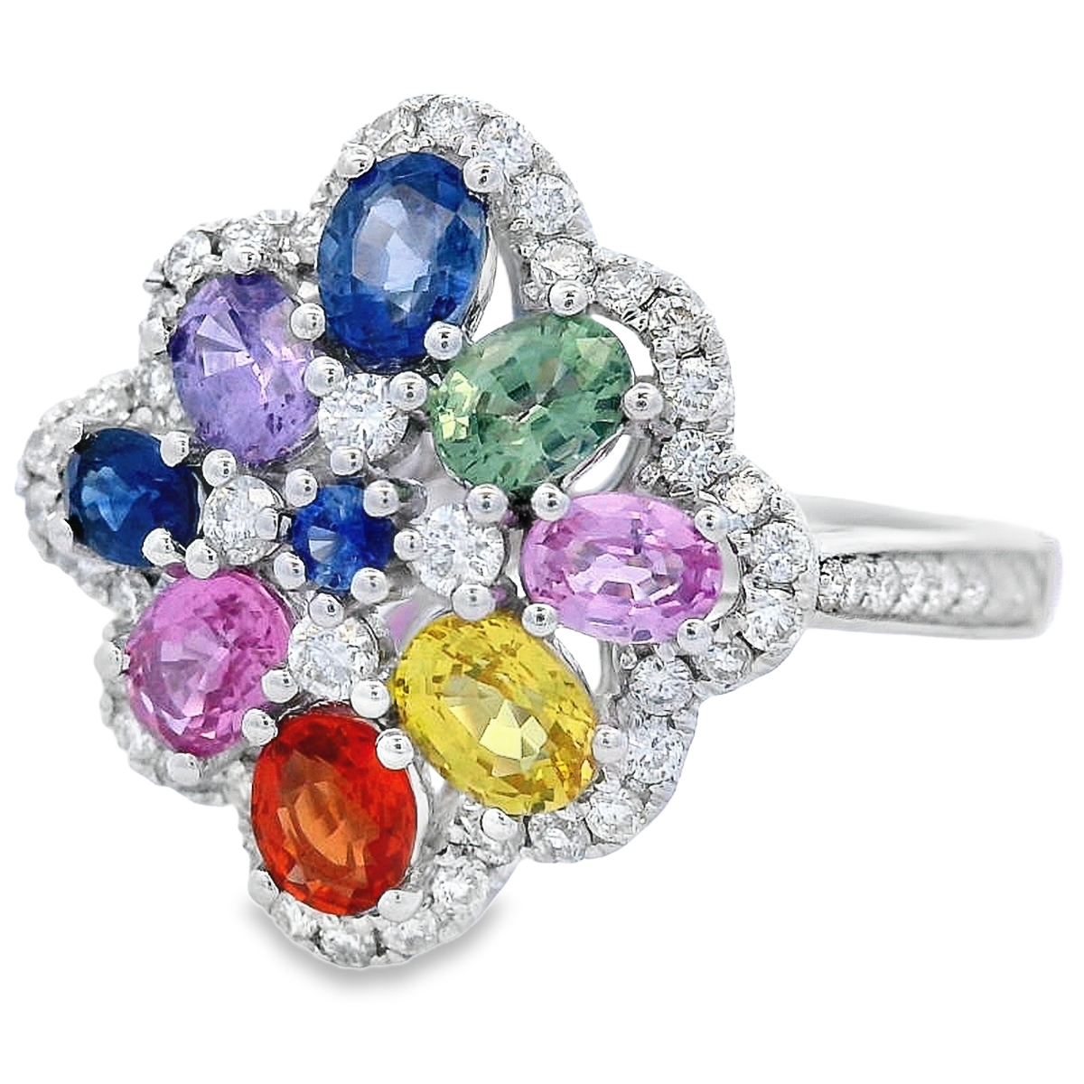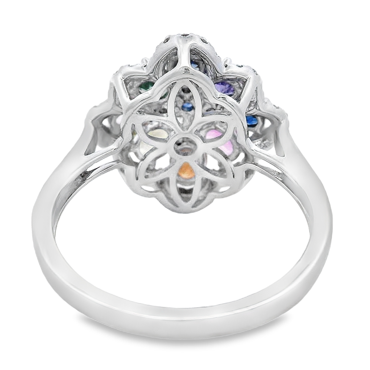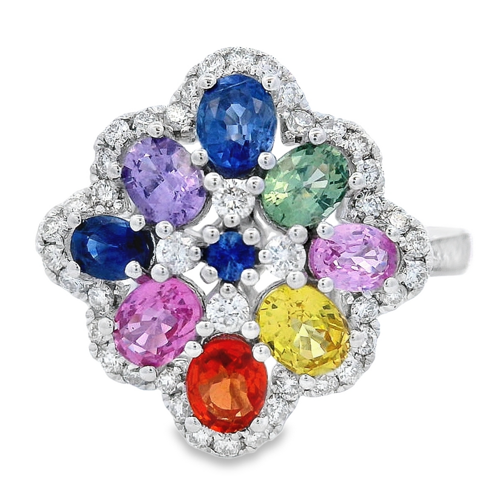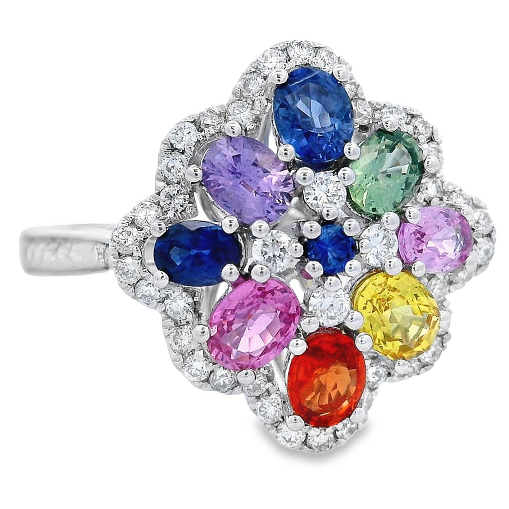 Vibrant and intricately designed, this 14K white gold ring features a round blue sapphire at its center, surrounded by four round diamonds and a striking array of multi-color oval sapphires. A scalloped halo of round diamonds encircles the entire design, while additional diamonds accent the ring’s shoulders for added brilliance. This colorful, floral-inspired piece combines elegance with playful sophistication—ideal for gemstone lovers or anyone looking for a standout statement ring.