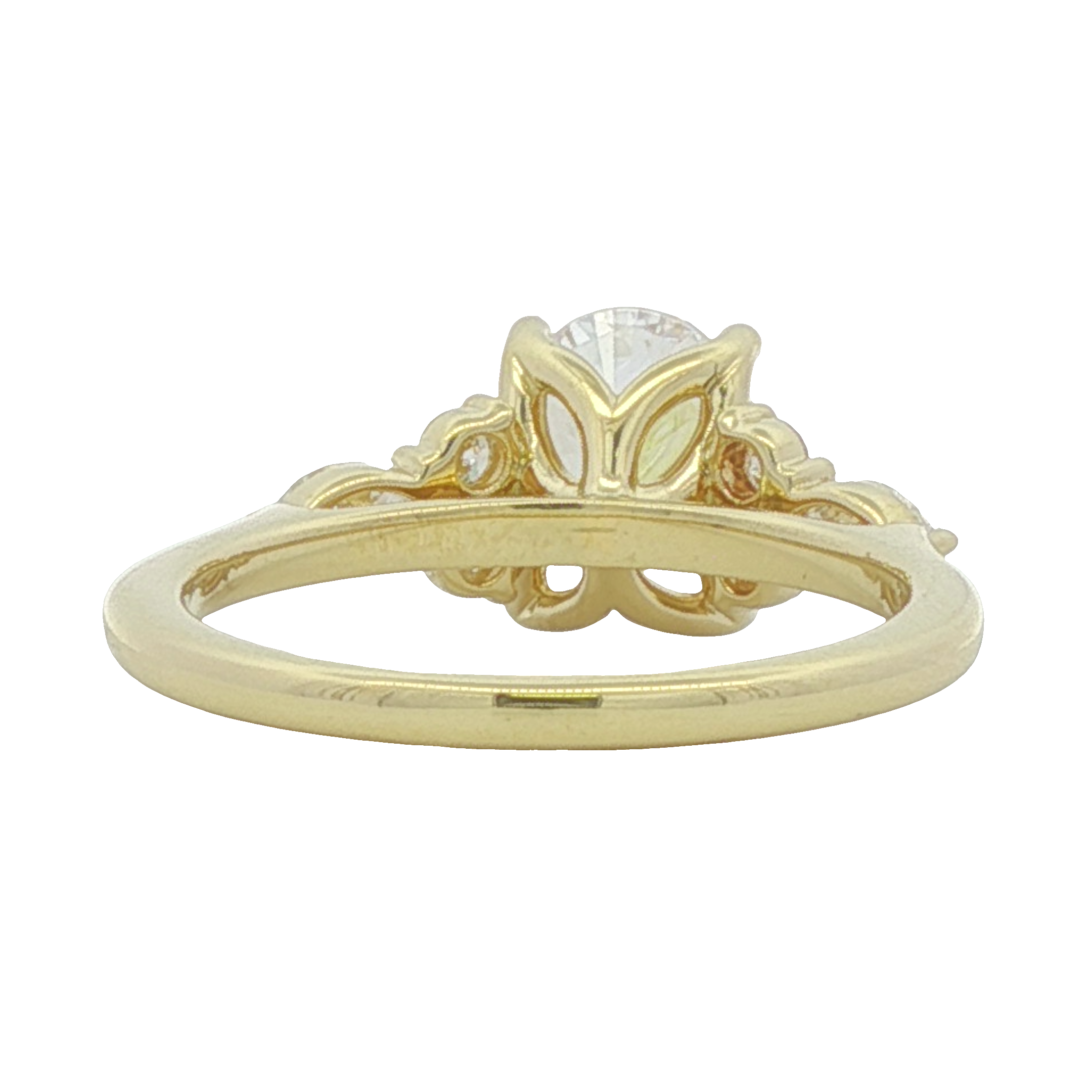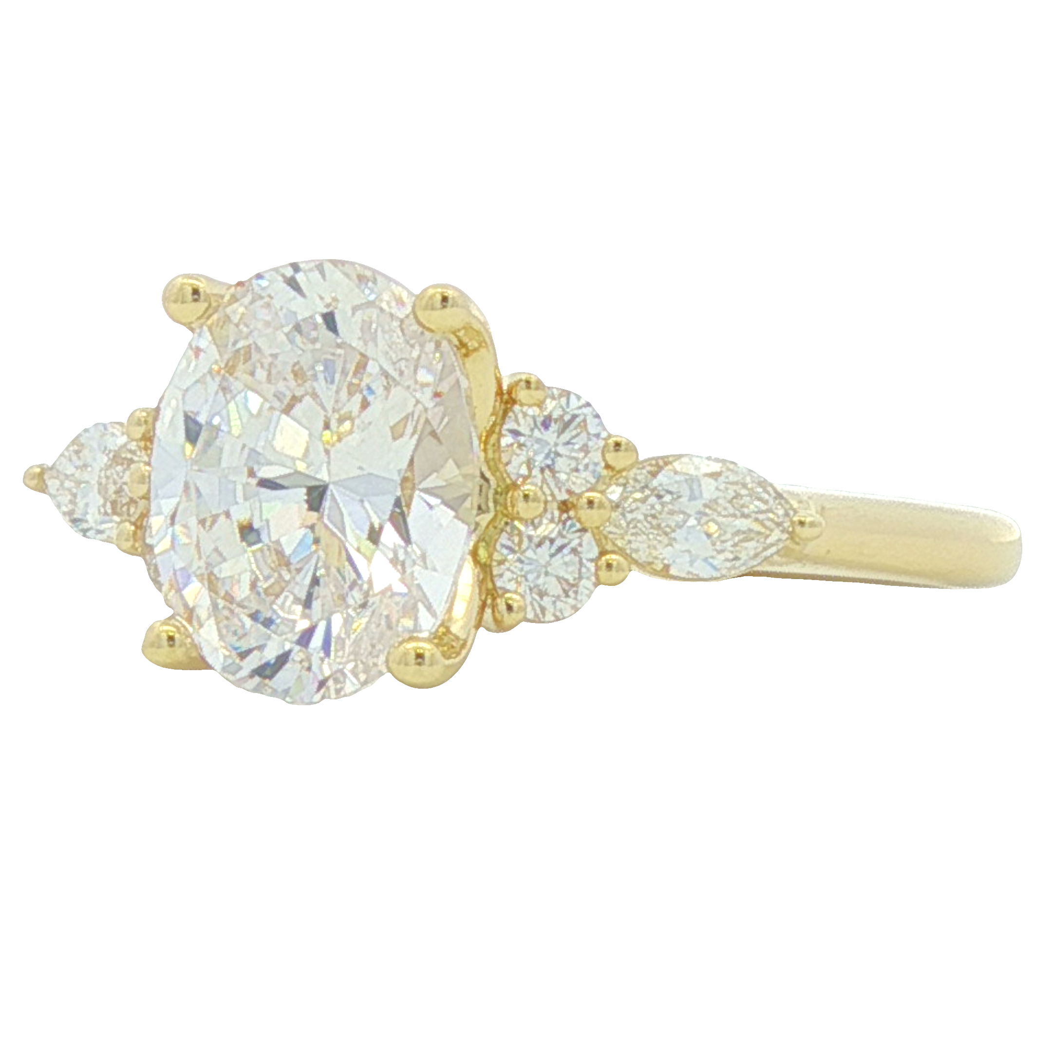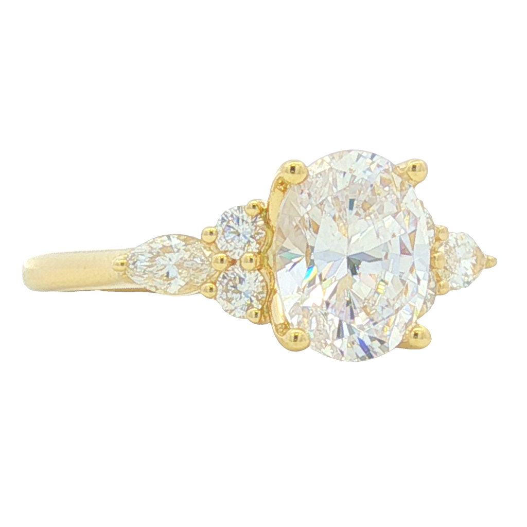 This 14K yellow gold diamond engagement ring setting showcases timeless elegance with 0.41 carats of accent diamonds. Designed to hold a 9x7mm oval center stone (sold separately), the ring features three sparkling diamonds on each side—two round and one marquise—for a distinctive, graceful design. A classic yet unique choice for creating your dream engagement ring.