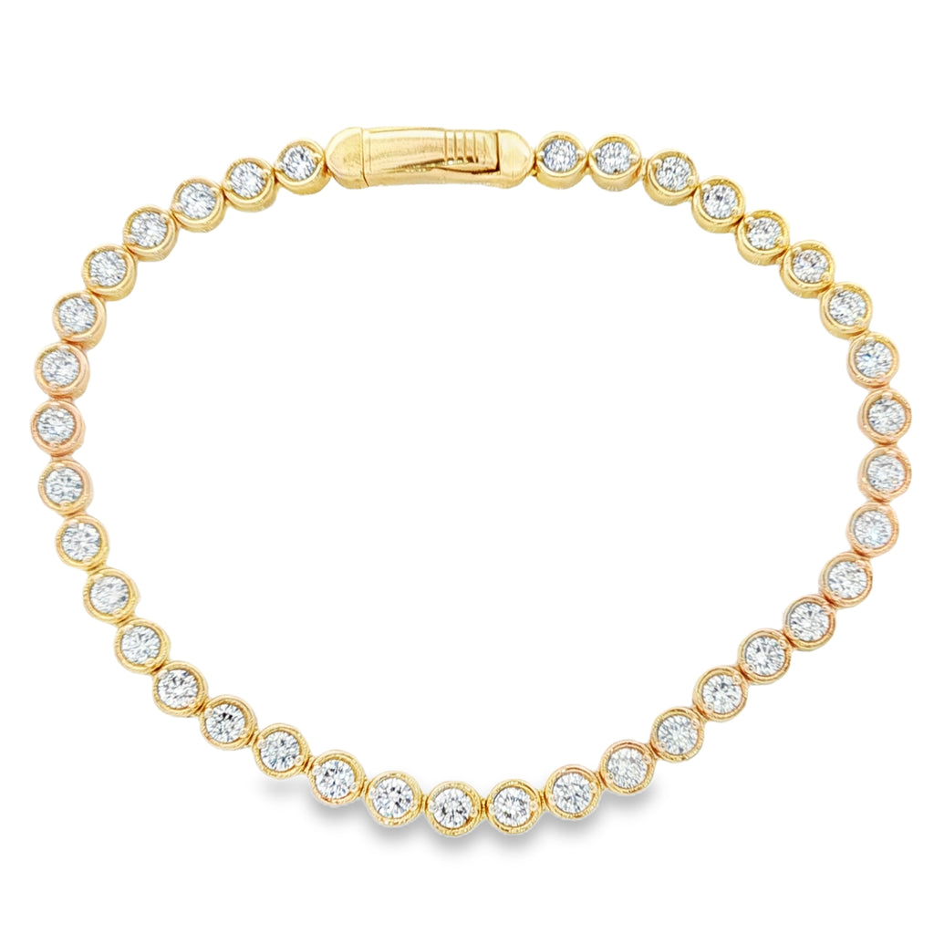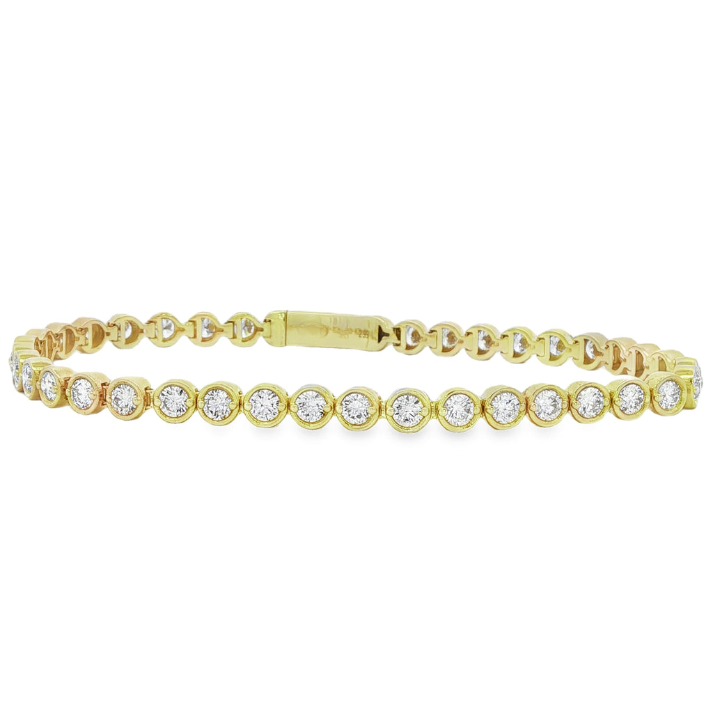 This 14K yellow gold tennis bracelet dazzles with 2.99 carats of round bezel-set diamonds that travel all the way around for continuous brilliance. Designed with a secure push-button clasp, this timeless bracelet offers both elegance and everyday wearability, making it a luxurious addition to any fine jewelry collection.