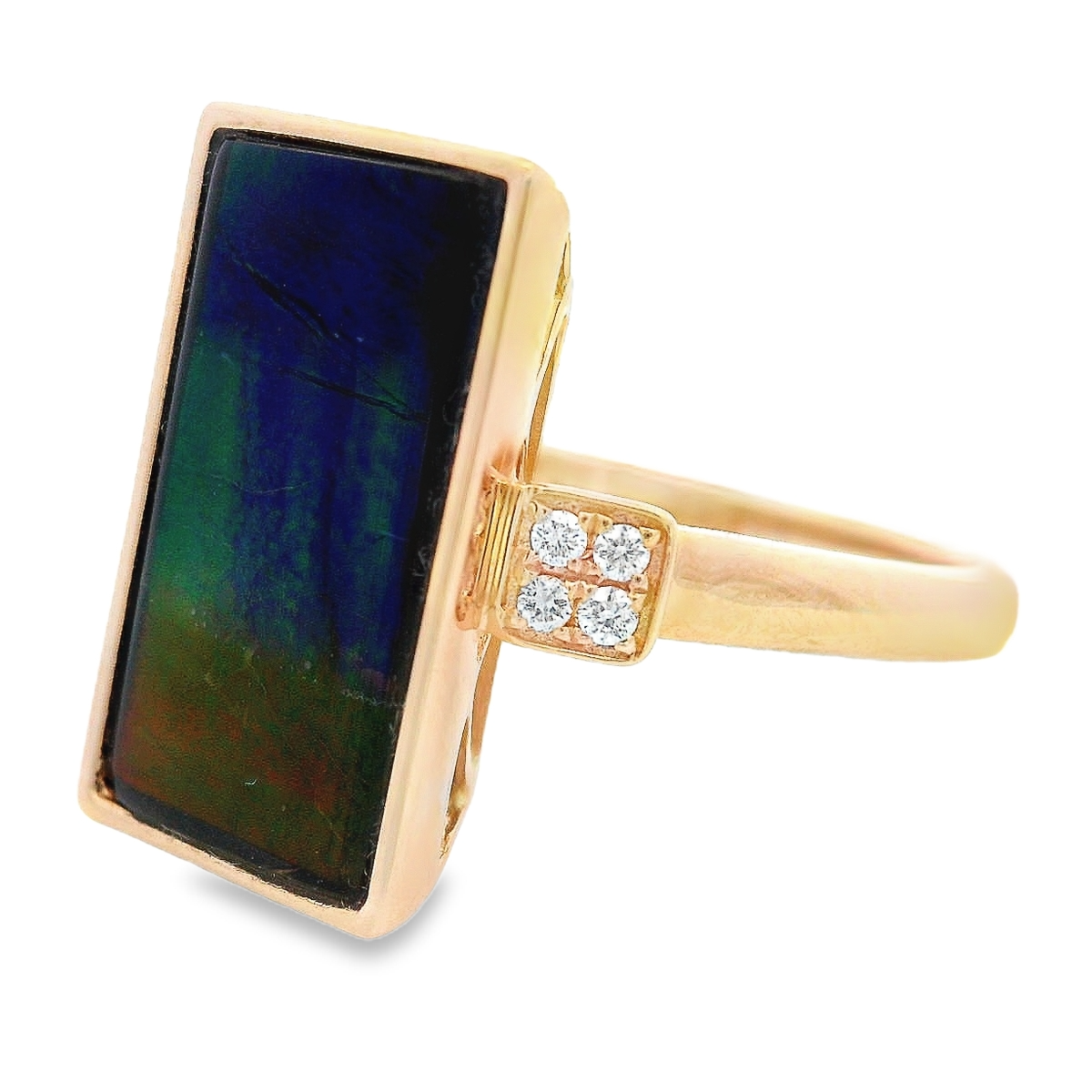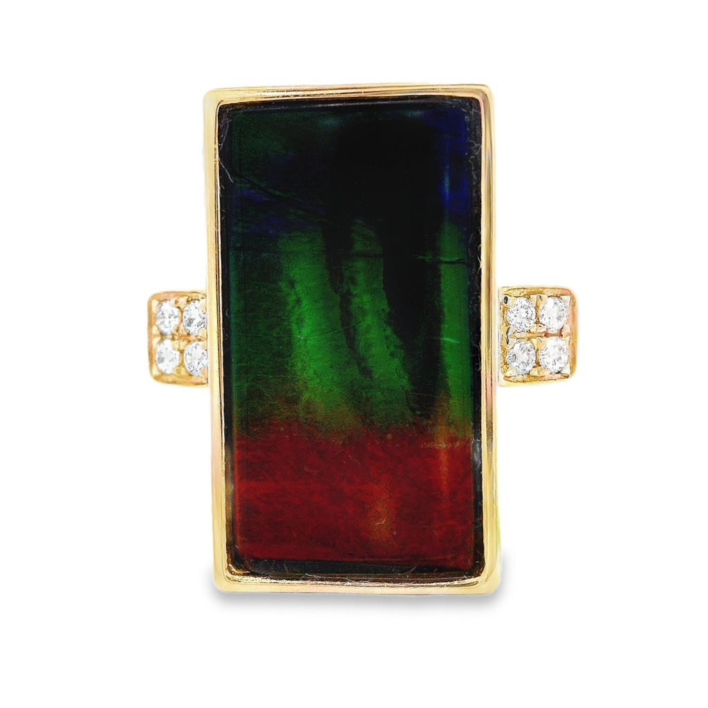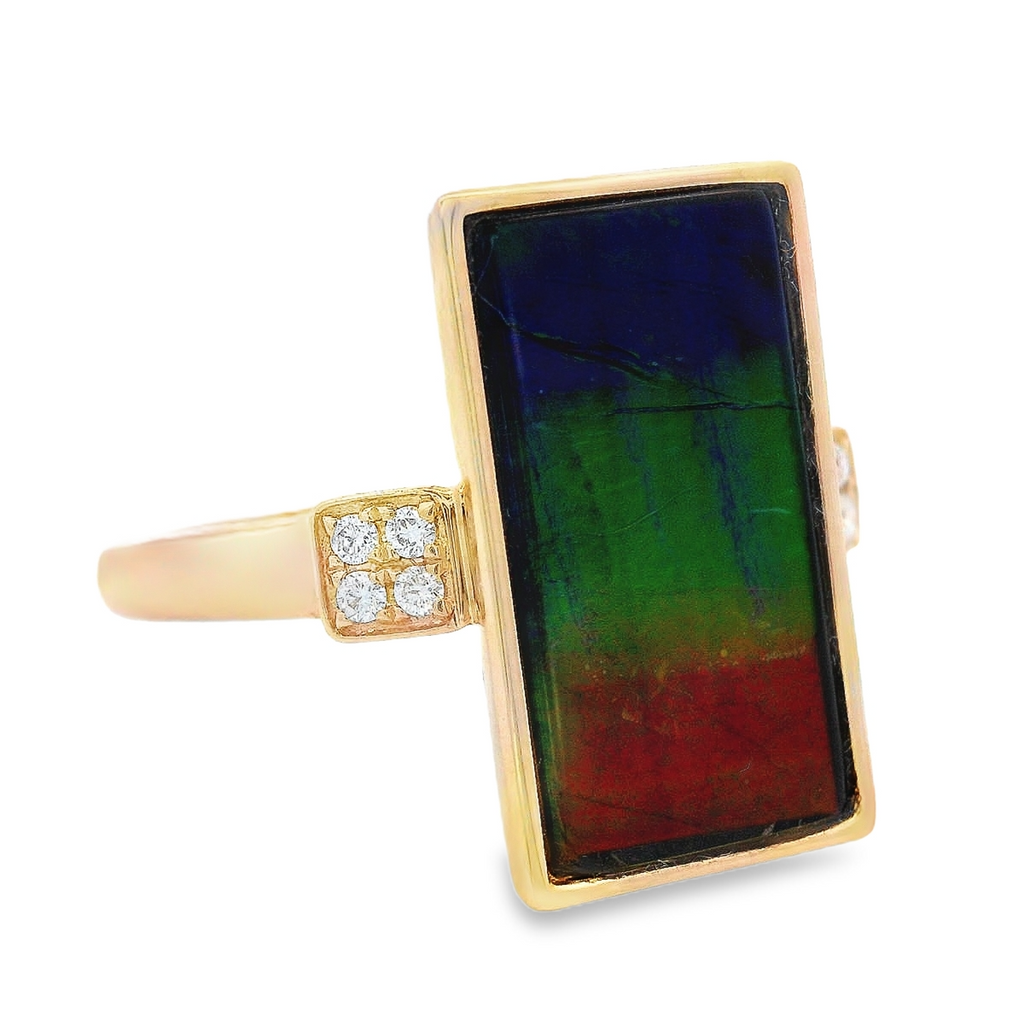 Bold and captivating, this 14K yellow gold ring features a 3.48 carat rectangular cabochon ammolite, celebrated for its vivid, iridescent color play. Four round diamond accents on each side—totaling 0.06 carats—enhance the brilliance and frame the center stone with refined sparkle. The warm gold setting complements the ammolite's fiery hues, creating a striking, one-of-a-kind design perfect for collectors or those drawn to unique natural gemstones.
