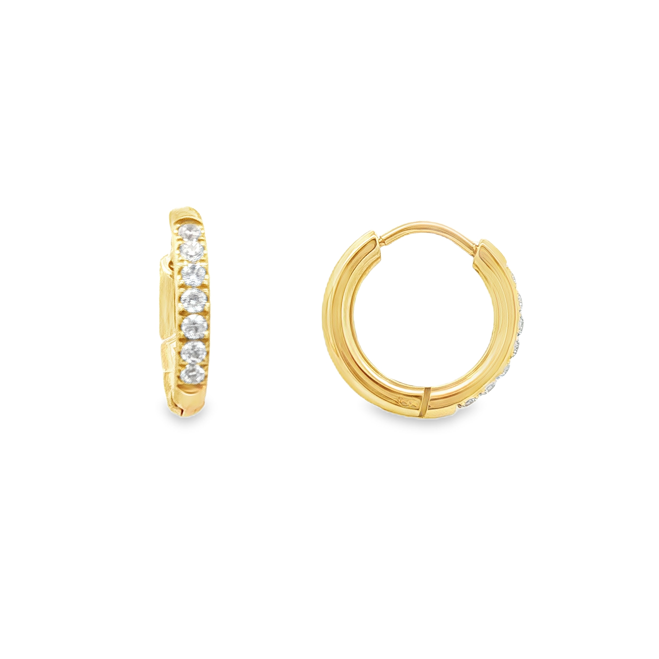 Add everyday sparkle with these gold ion-plated stainless steel cubic zirconia huggie hoop earrings. Each hoop is accented with brilliant cubic zirconia, offering diamond-like shine in a durable and tarnish-resistant stainless steel design. Finished with a secure snap closure, these classic yet modern hoops are perfect for daily wear or special occasions.