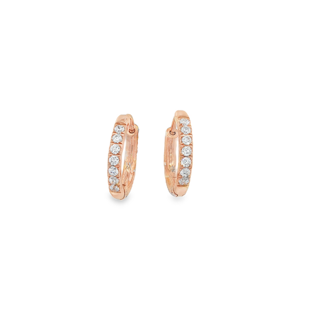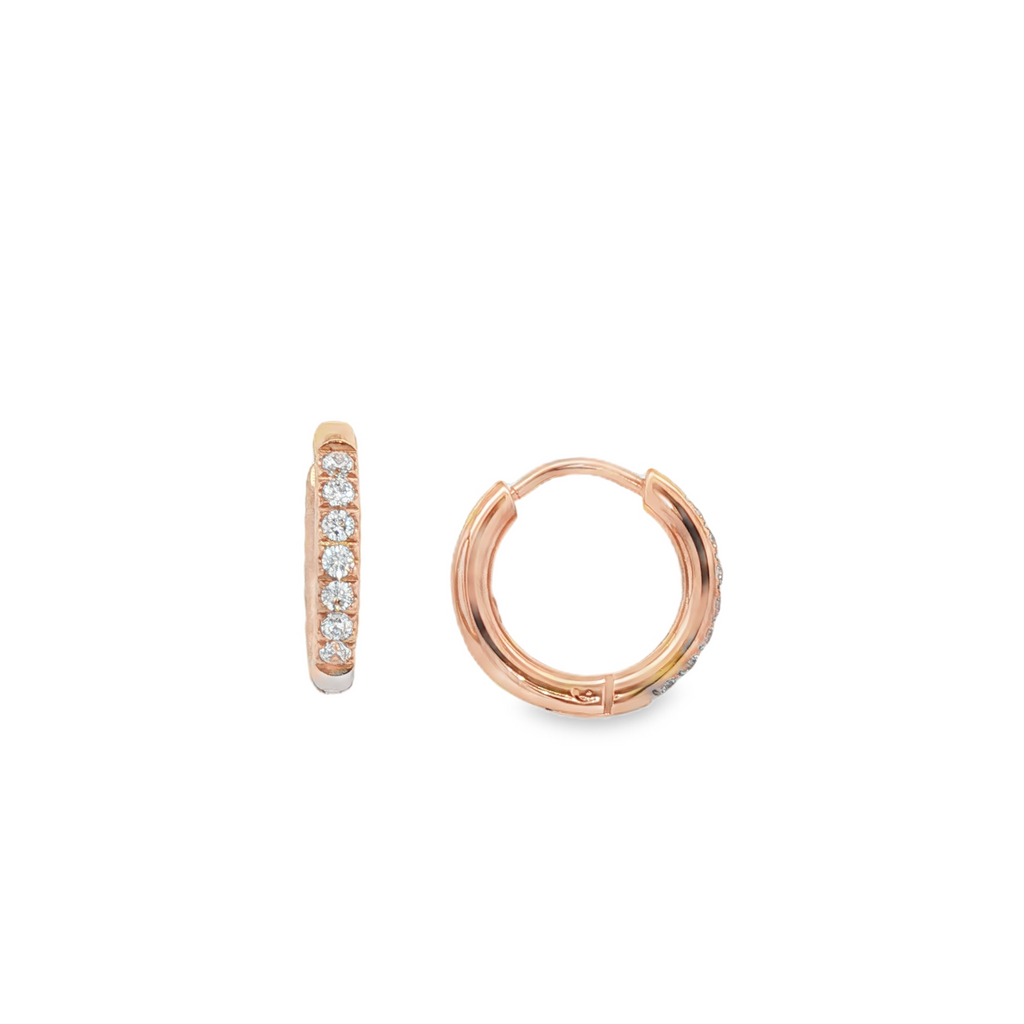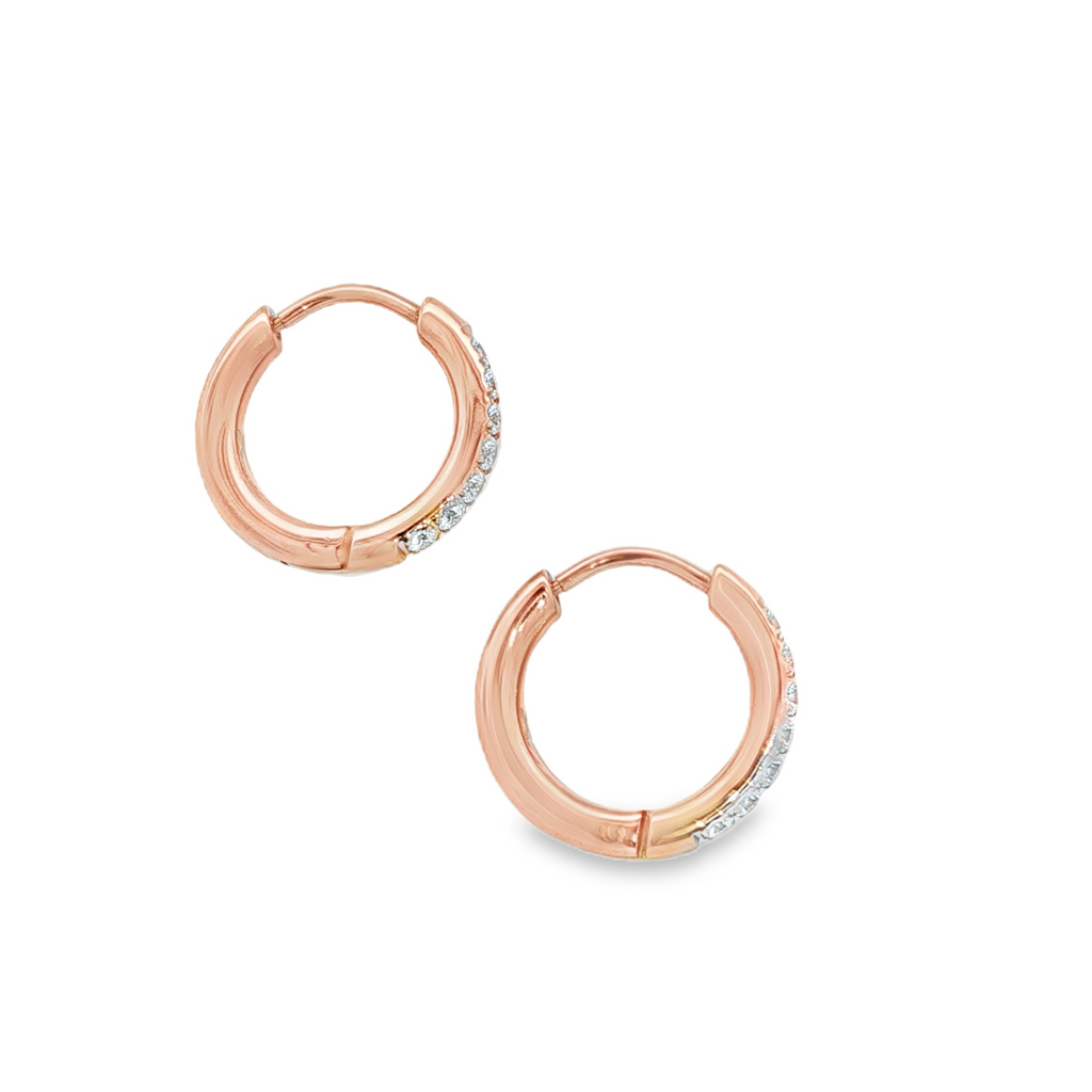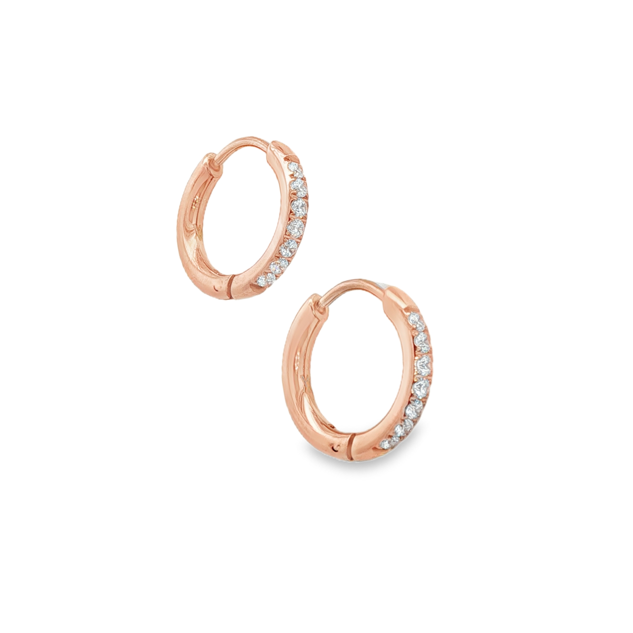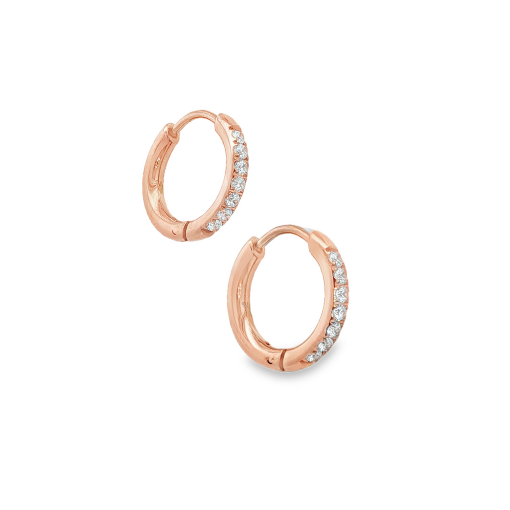 Elevate your style with these rose ion-plated stainless steel 14MM huggie hoop earrings. Each hoop is accented with sparkling cubic zirconia, adding a touch of brilliance to the warm rose-toned finish. Designed with a secure snap closure, these durable and lightweight earrings offer all-day comfort and timeless elegance. Perfect for everyday wear or special occasions, they bring modern sophistication to any jewelry collection.