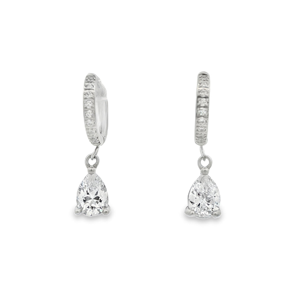 Design: Huggie hoop earrings with pear-shaped cubic zirconia drops and round cubic zirconia accents on the hoops Closure: Secure snap closure for a comfortable, reliable fit