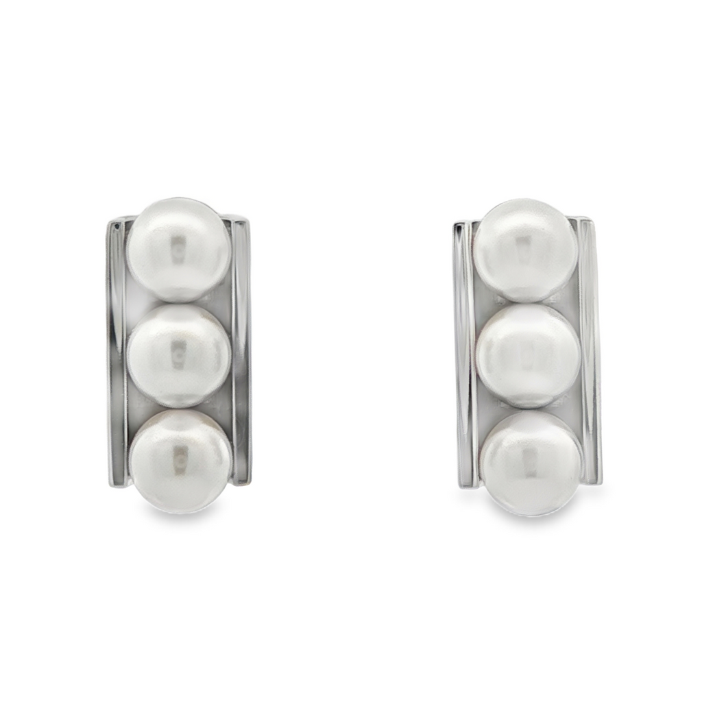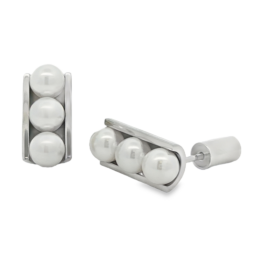 Add timeless elegance to your jewelry collection with these stainless steel pearl drop earrings. Each earring showcases three luminous pearls arranged in a vertical drop for a refined, classic look. Designed with secure posts and friction backs, these earrings offer both comfort and durability. A versatile accessory, perfect for weddings, evenings out, or elevating everyday style.